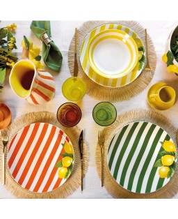 Servizio piatti Fade Lemon in ceramica 18 pezzi per 6 persone. Colori assortiti arancio, giallo e verde, design vivace e moderno.